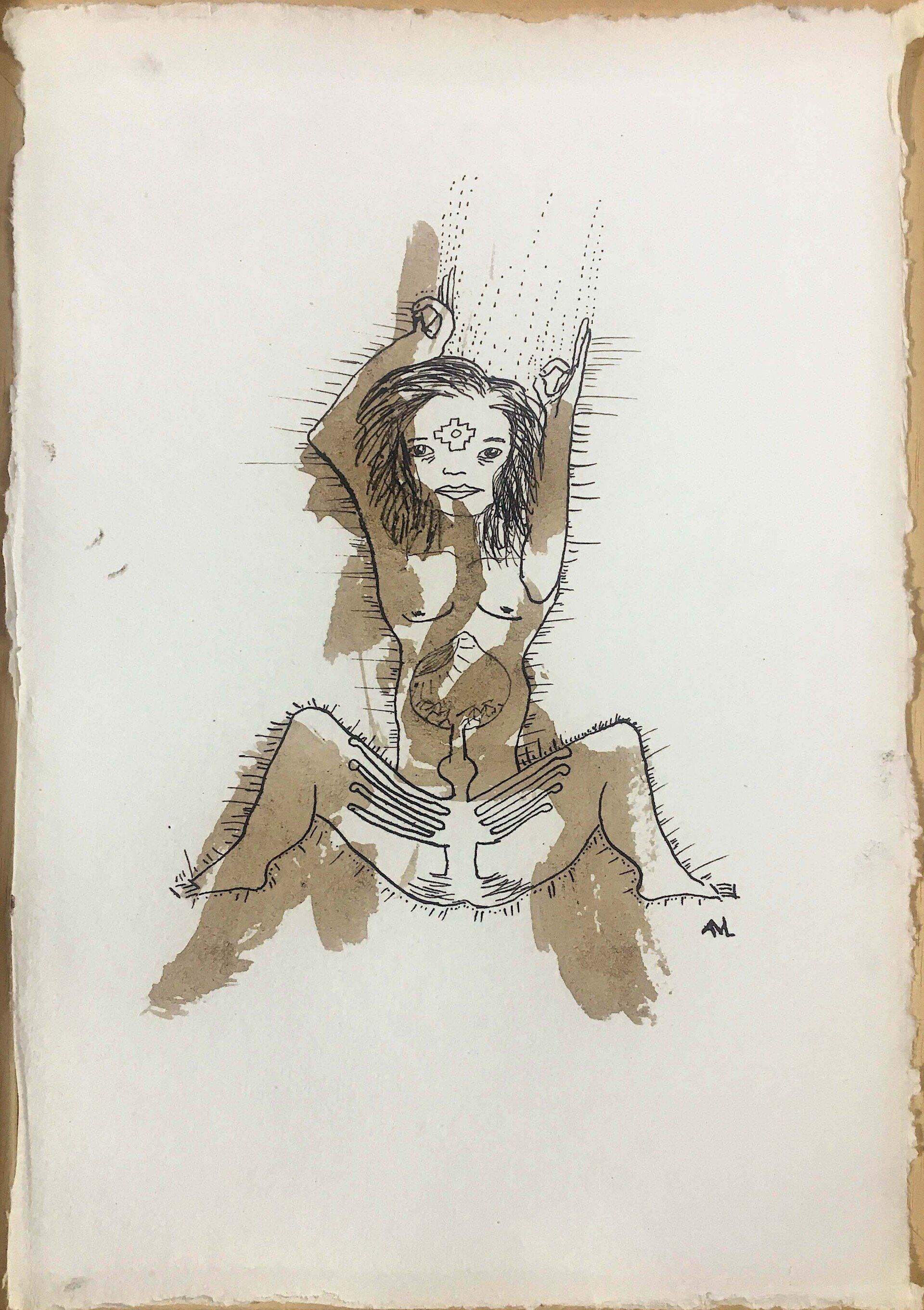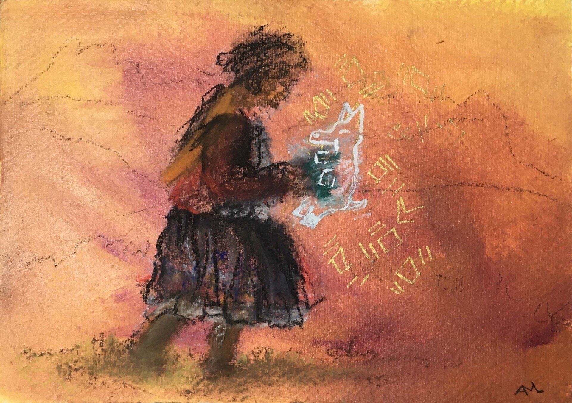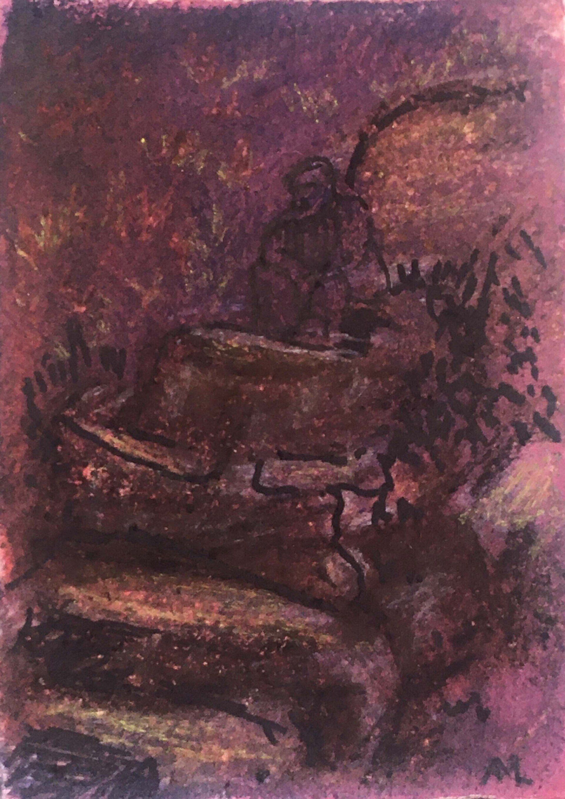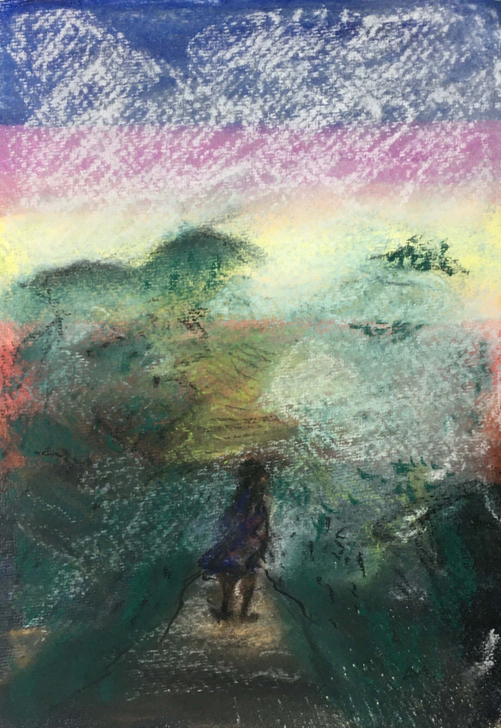 Met water vermengbare olieverf op waterbasis, pastelkrijt, pen